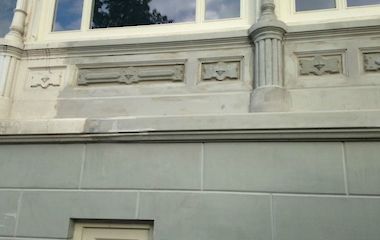 Renovatie gevel villa. Herstel buitengevel en stucwerk in blokverband. Herstel van lijsten en ornamenten.